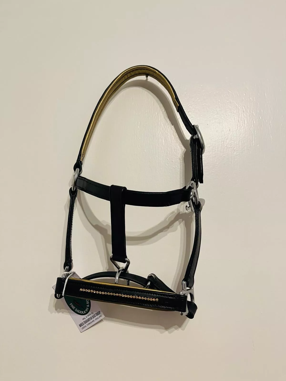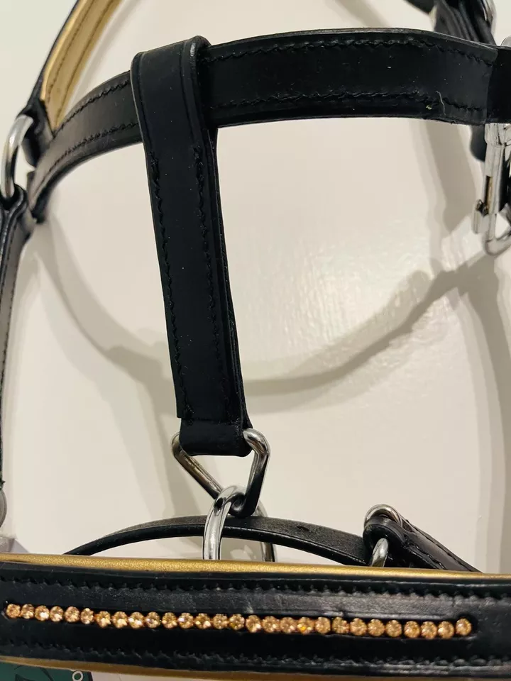 Mini Shetland Leather Headcollar Bling Bling in gold MINI SHETLAND leather halter is a stylish and fully adjustable accessory for your mini Shetland. The elegant black design is accentuated with bling padding a touch of sophistication to your equestrian gear. Crafted in India by MIRZA 1973, this halter is made of high-quality materials, ensuring durability and comfort for your horse. Whether you're out for a leisurely ride or competing in an equestrian event, this halter is the perfect choice. The adjustable fit ensures that your horse will be comfortable, and the sturdy leather construction ensures that this halter will last for years to come.... Read More