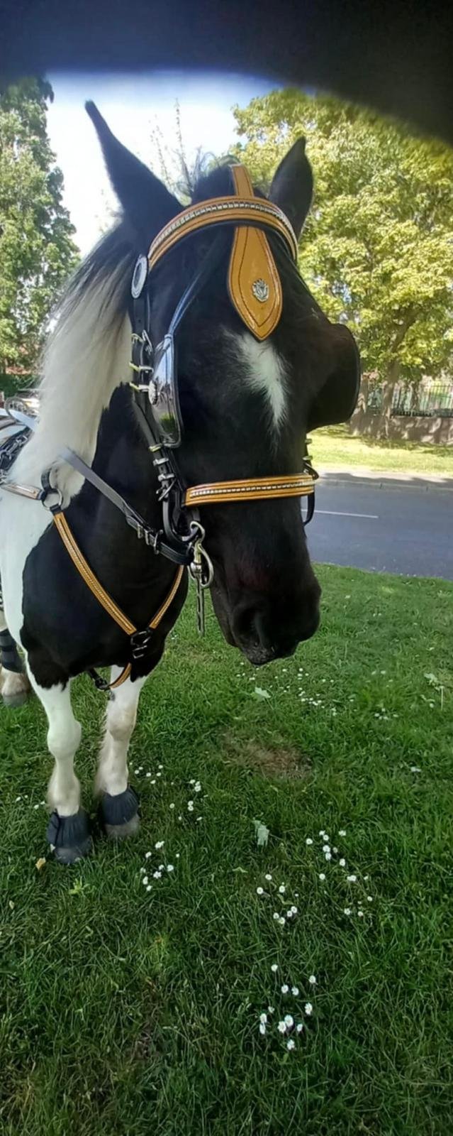 New Horse size full/Cob complete set Quick Hitch Leather supreme top quality harness brass fittings with brass keeper/kidney beaters black and yellow patent.